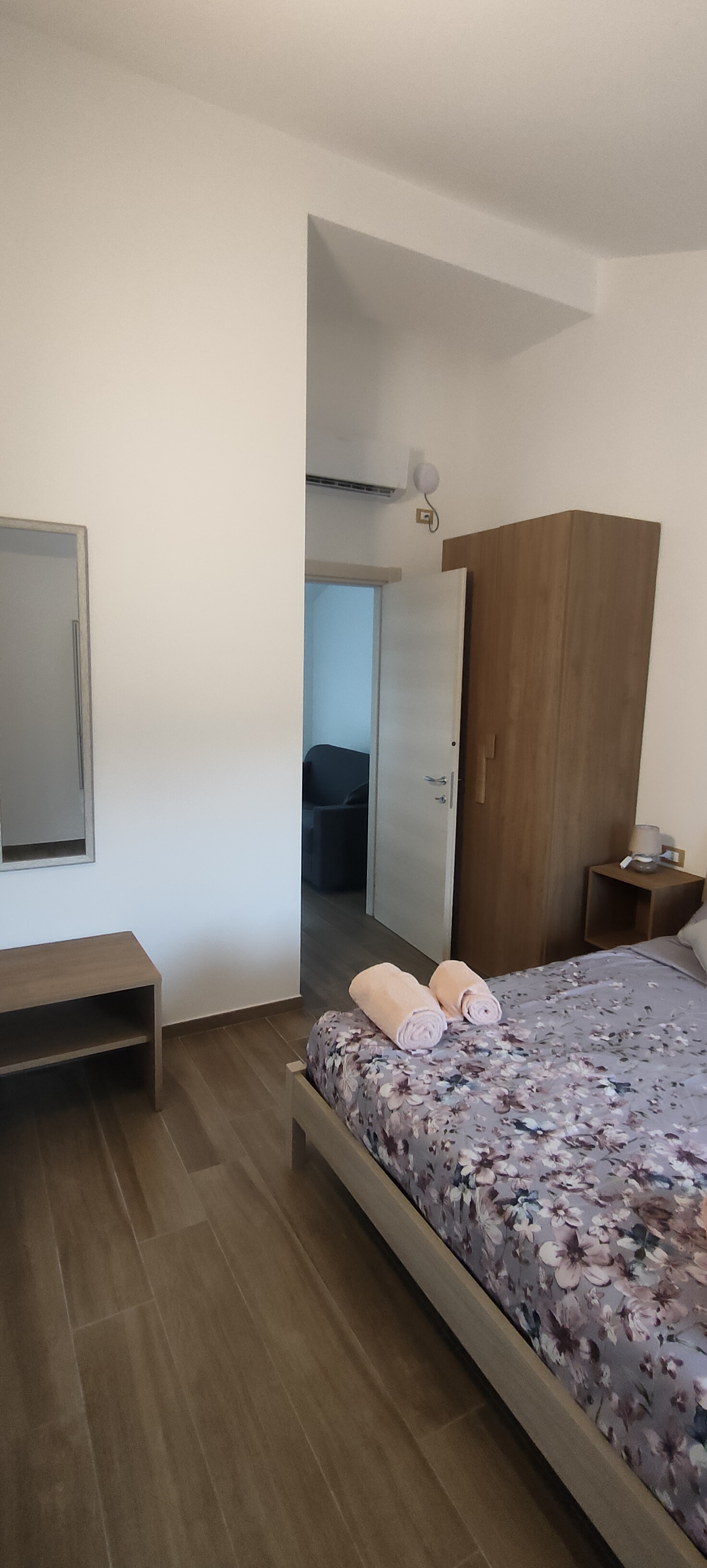 Camera da letto ( letto matrimoniale, comodini sospesi, armadio, mobile posa valigia e specchio)