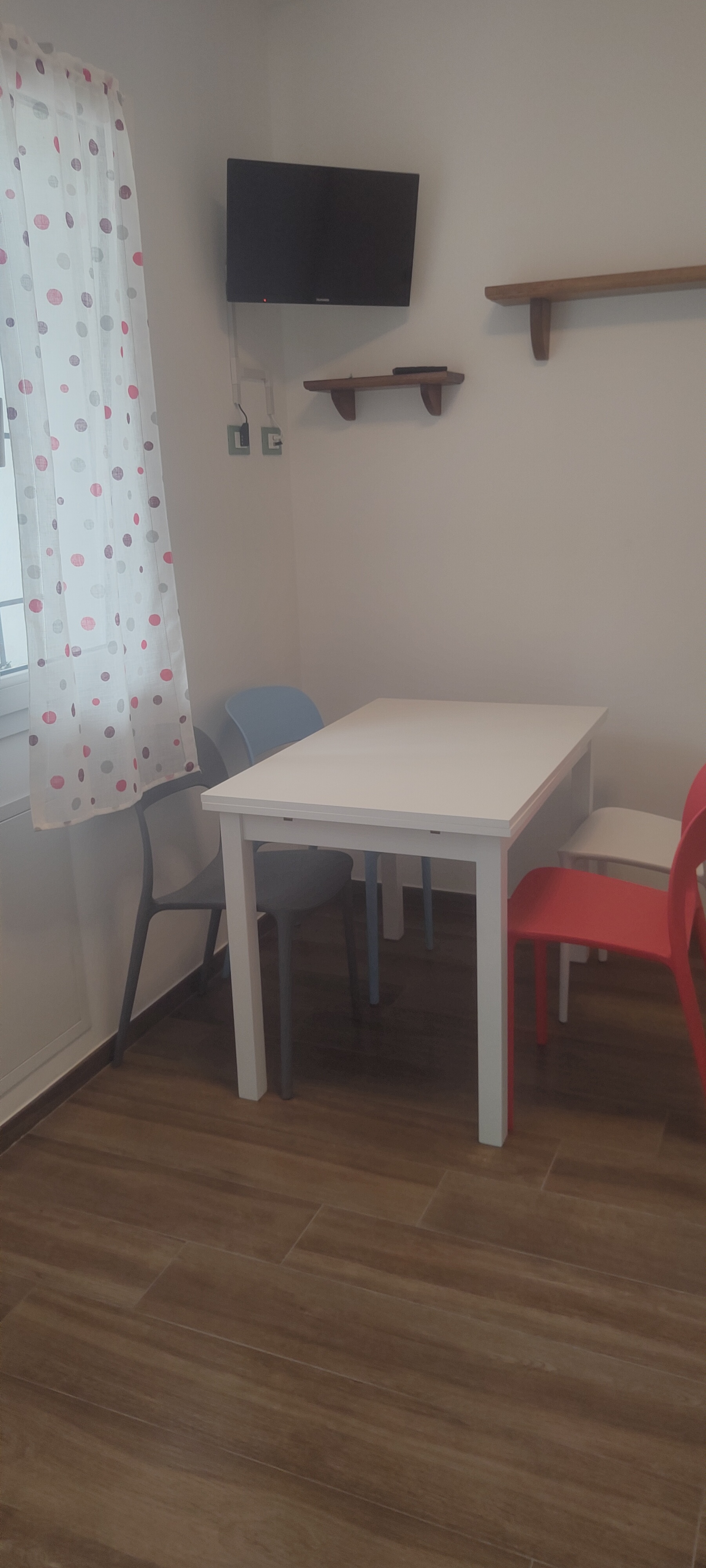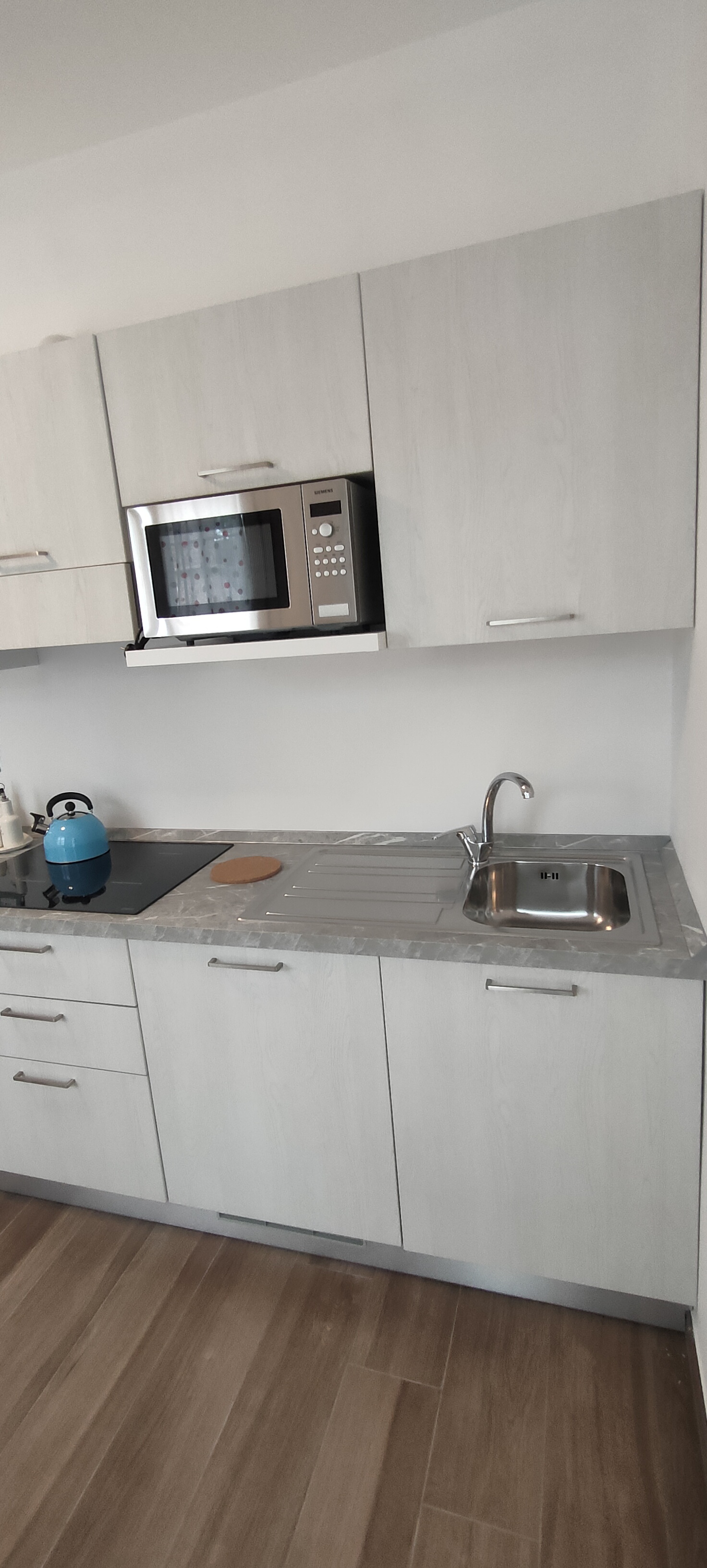 Soggiorno con angolo cottura – piastre induzione, forno microonde, frigo, tovaglie, stoviglie, posate ed utensili da cucina, bollitore, tv sat a schermo piatto 24″ tavolo e sedie.